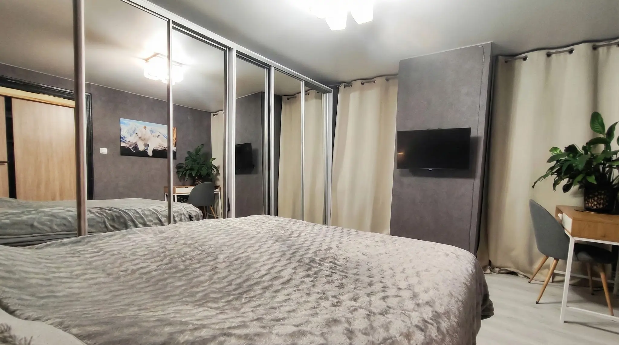 де справді хочеться відпочивати. Величезна дзеркальна шафа-купе візуально розширює простір і дає багато місця для зберігання. М’яке світло, спокійні тони та комфортне ліжко створюють атмосферу готельного рівня.