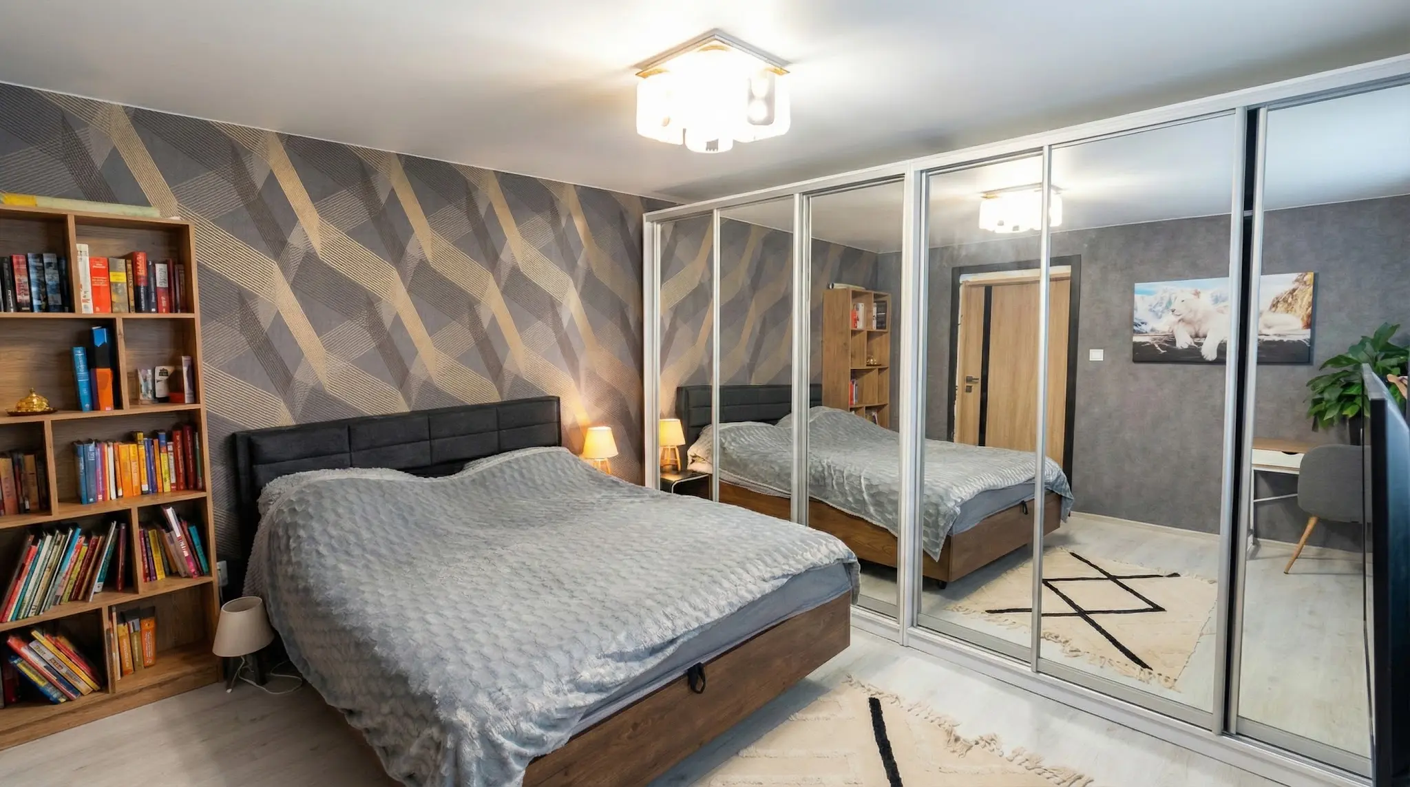 Акцентна стіна з геометричним візерунком додає характеру, а робочий куточок біля вікна ідеально підходить для дому та роботи. Тут усе виглядає доглянуто й “під ключ” — можна заїжджати без зайвих витрат.