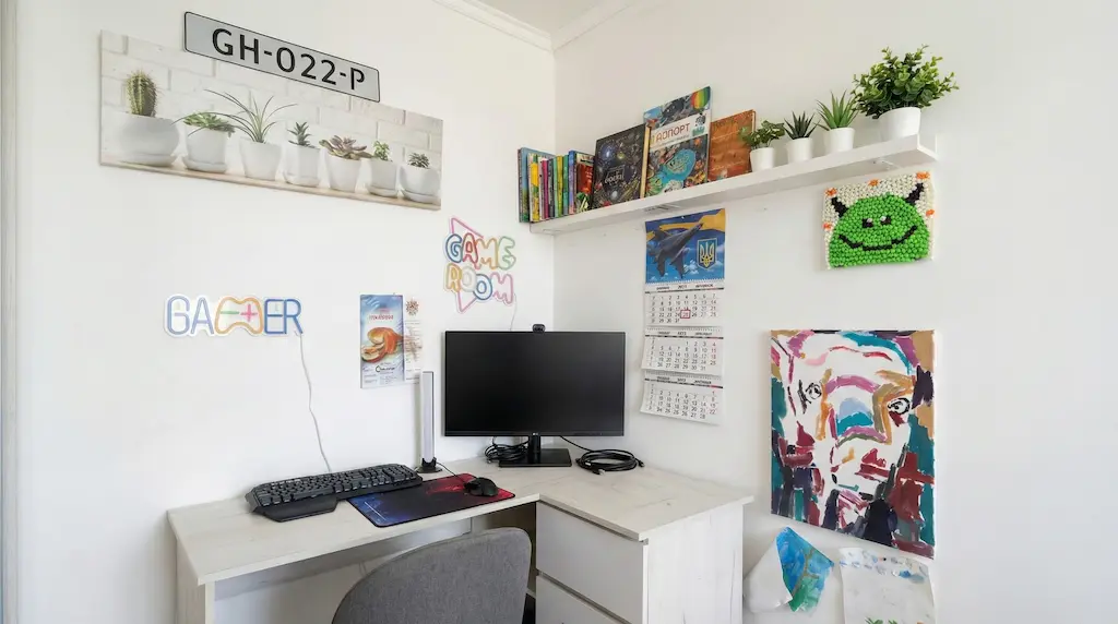 Тут є тиха робоча зона, місце для хобі та достатньо простору для щоденного комфорту. Завдяки світлу та акуратному ремонту кімната виглядає теплою й домашньою — саме те, що цінують у сімейному житлі.