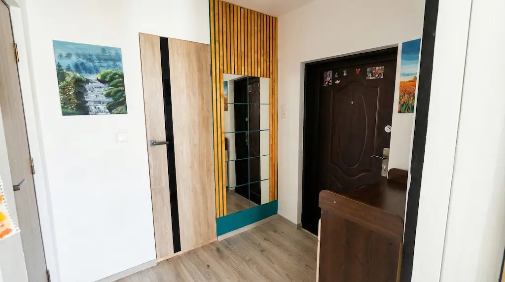 який з першого кроку задає приємний настрій у всій квартирі. Є зручне місце для зберігання, а дзеркало візуально додає простору. Вхідна група виглядає доглянуто й акуратно — без відчуття тісноти.