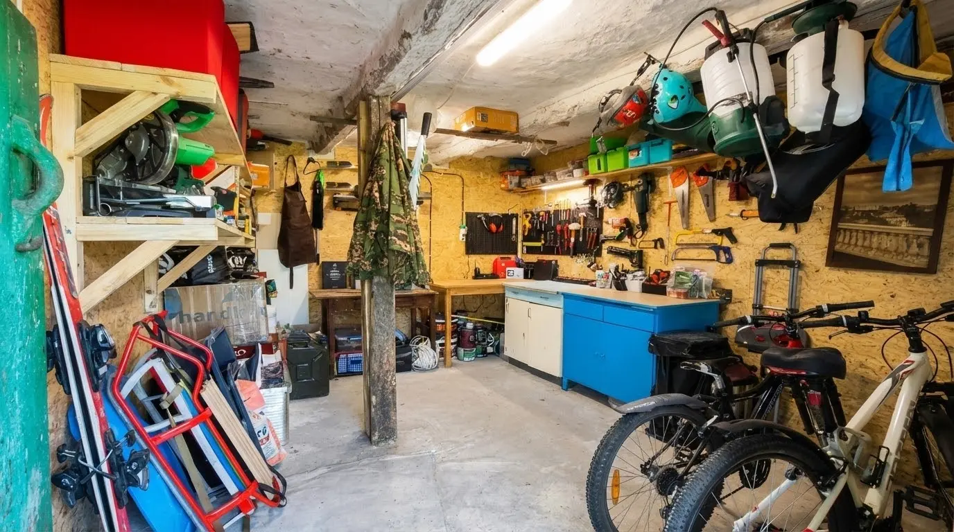 Приміщення підходить для зберігання велосипедів, садового інвентарю, газонокосарки та сезонних речей. Усе під рукою, акуратно та без зайвого хаосу — справжній плюс для активного побуту й догляду за територією.
