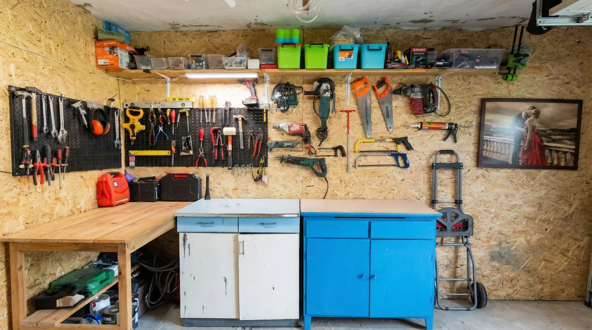 Усередині облаштована зручна робоча зона зі столом і полицями, а також практична система зберігання інструментів на стіні. Простір легко організувати “під себе” — від дрібних інструментів до більшого обладнання.